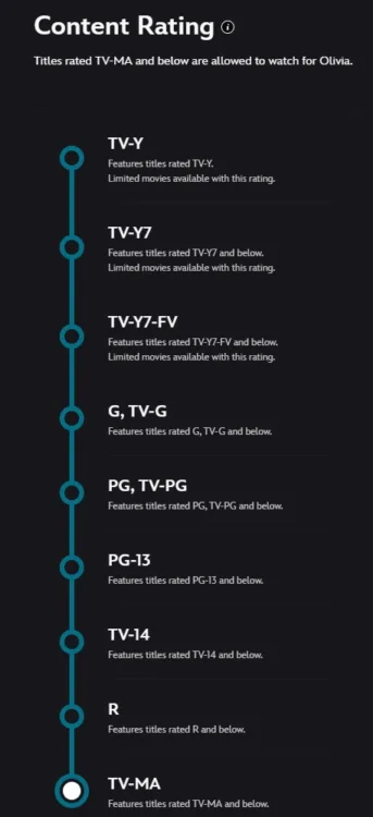 You have to turn off Junior Mode to enable ratings, but once you do, you can block certain TV and film ratings like you’d expect from a streaming service’s parental controls. Disney+ does host R-rated content now, and even more if you’re bundling with Hulu, so you’ll want to keep an eye on this setting if your kids have their own devices.